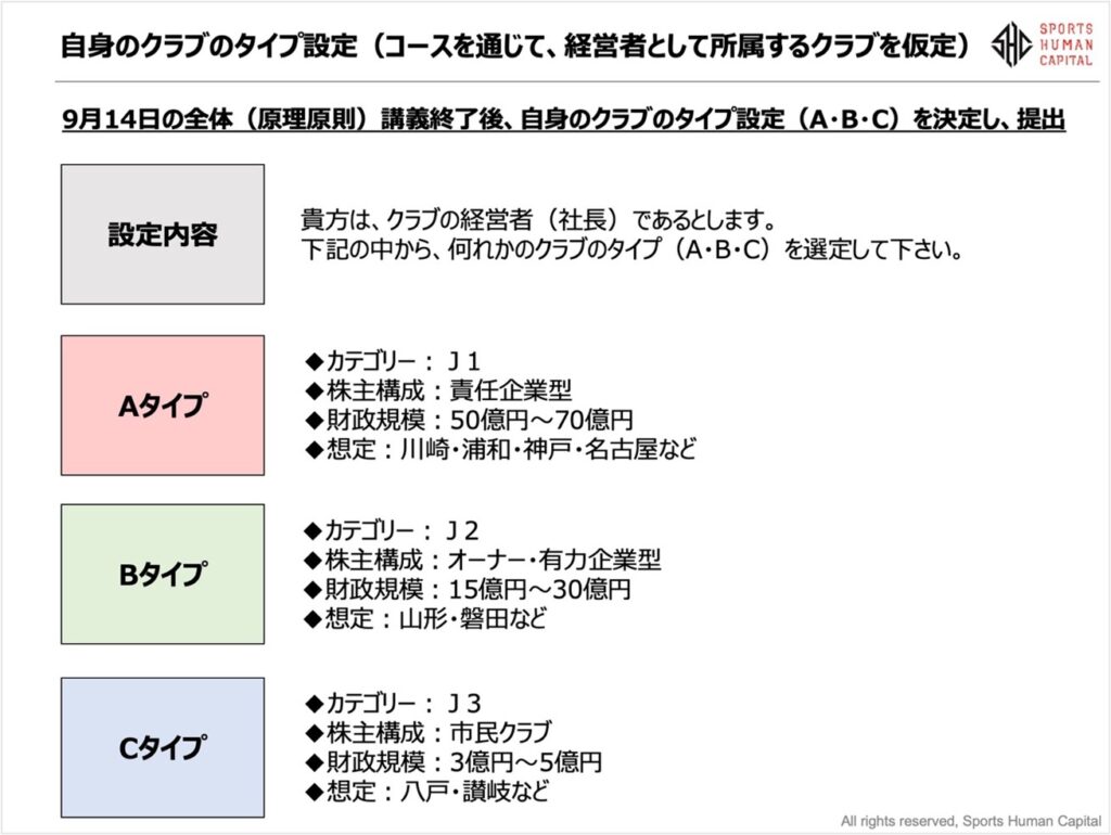 その仮定に立った上で、「フットボール」、「社会連携」、「to C」、「事業強化」、「経営基盤」、「施設整備」、6つのエリアの事前課題に取り組んでもらい、講義当日、同タイプ内での意見差異、タイプ別での比較等のディスカッションすることで、より自分事とした具体的なインプット・アウトプットが期待でき、知識の深い習得に繋げていただこうと思います。