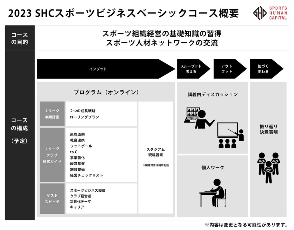 「スポーツ組織経営の基礎知識の習得」を軸として、マスターコースよりカジュアルなコース設計にて、受講の門戸を広げるため、今年度新設する「SHCスポーツビジネスベーシックコース」。