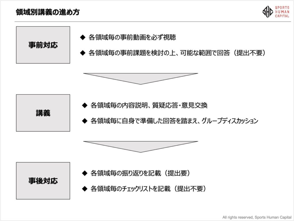 コース構成は基本的に、「Jリーグ中期計画」・「Jリーグ クラブ経営ガイド」の各領域のインプットを中心にしながら、ゲストスピーチで、クラブ経営者やDAZN様のようなステークホルダーの生の声等トレンドを掴み、最後に、この講座での学びをご自身のキャリアにどう活かしていくかというキャリアセッションを行います。