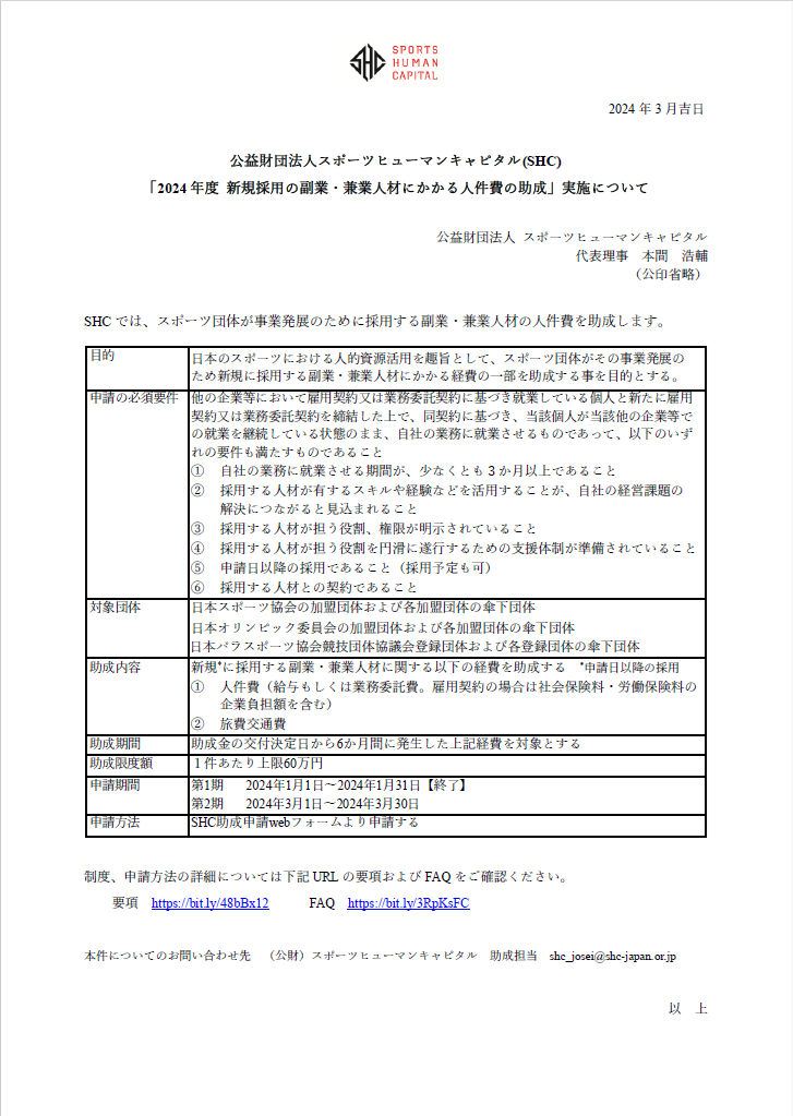 (公財)スポーツヒューマンキャピタル 助成担当 shc_josei@shc-japan.or.jp
