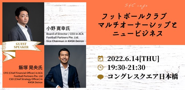 今回は、「フットボールクラブ マルチオーナーシップとニュービジネス」と題して、SHC修了生の小野寛幸氏、飯塚晃央氏をゲストにお迎えして、イベントを開催。