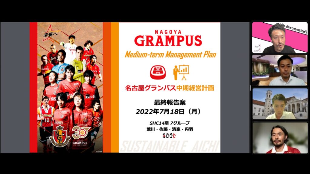 お題が名古屋グランパスエイトさんの中期経営計画ということで、難易度が高く大変だったが、やり甲斐があった。また、現場の方々の講義は、すべてにおいて熱気があり、チームをよりよくしていきたいという思いをひしひしと感じた。